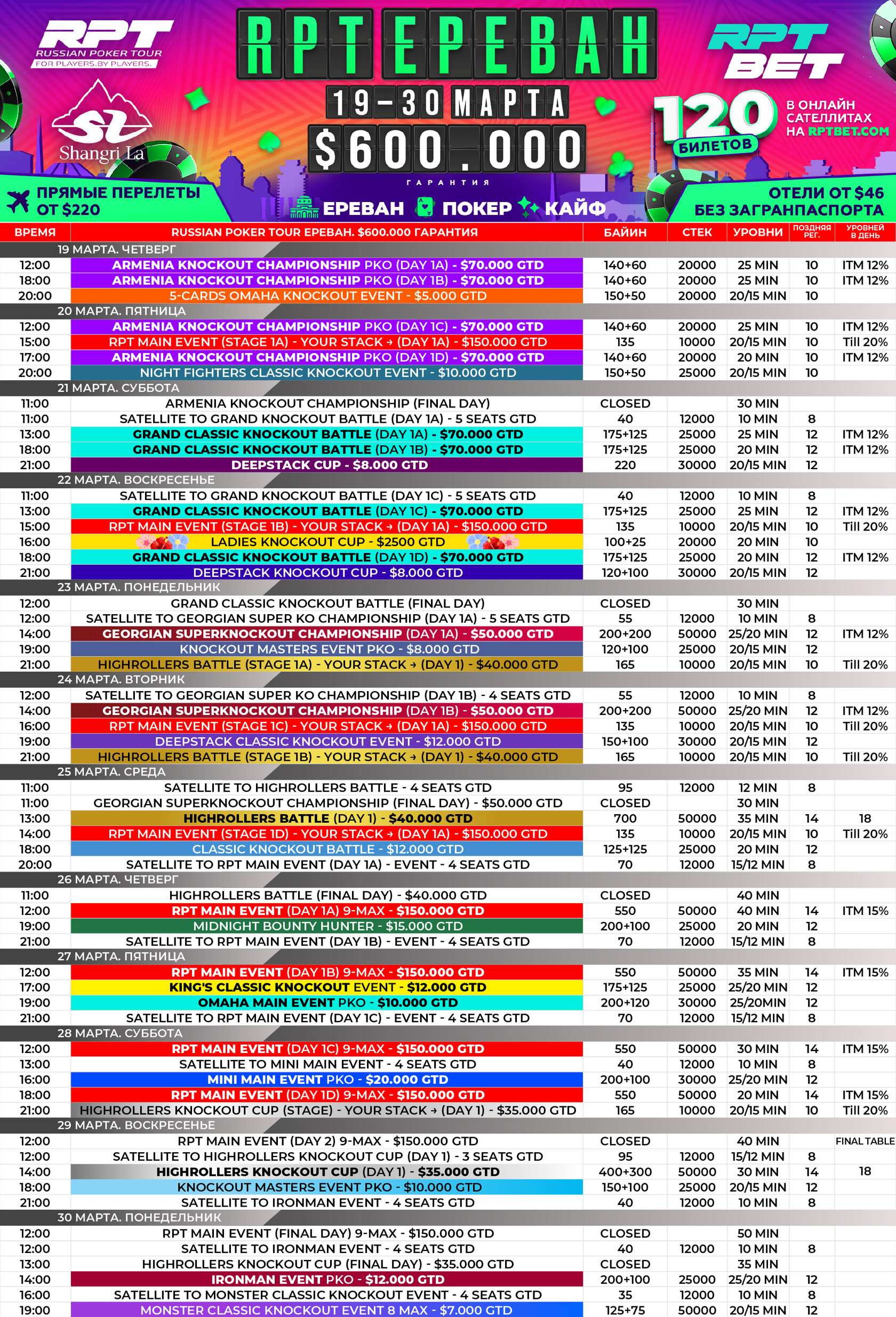 Общая гарантия — $600,000! Но мы уверены, что сумма разыгранных призовых будет значительно выше и постараемся сделать мартовскую серию RPT ещё более яркой, насыщенной и интересной.