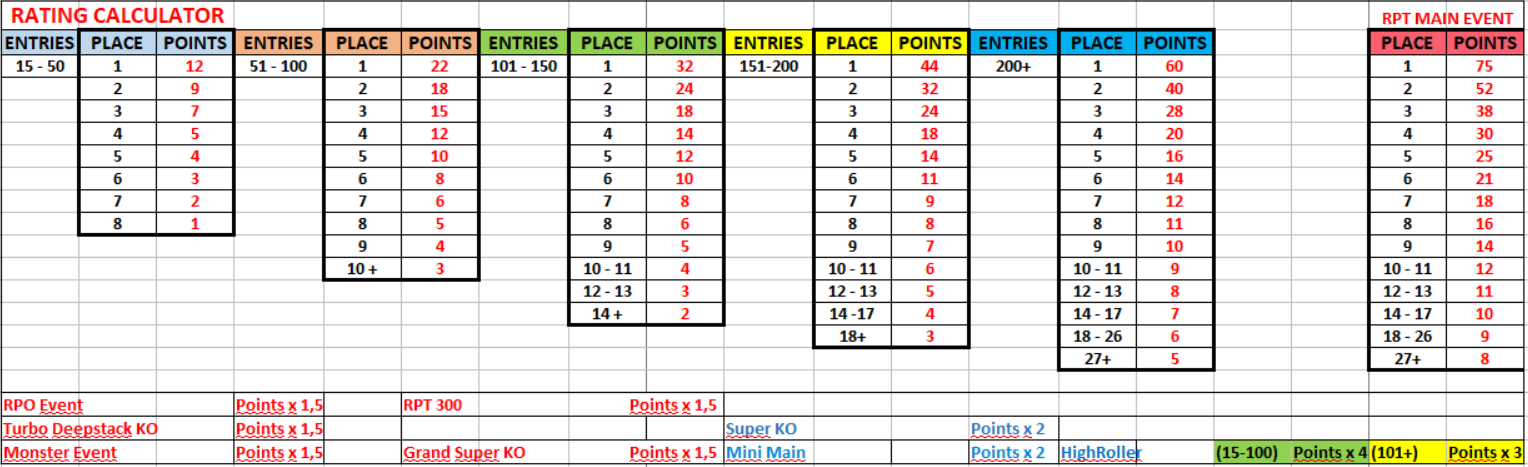 Размер начисляемых баллов зависит от общего количества участников в турнире и от его стоимости, поэтому внизу таблицы указаны коэффициенты, которые будут применены к определённым событиям.